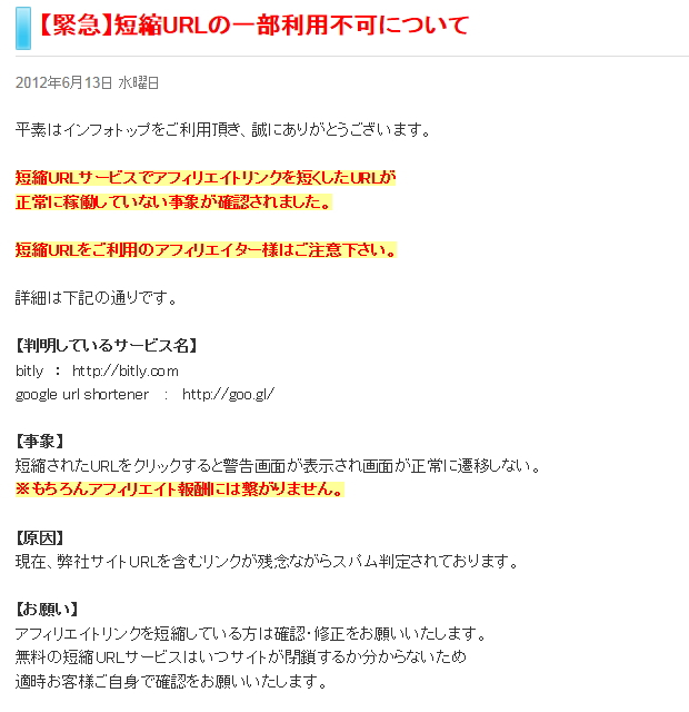 「bitly」と「Google url shortener」でインフォトップのアフィリエイトURLが無効となりました。
