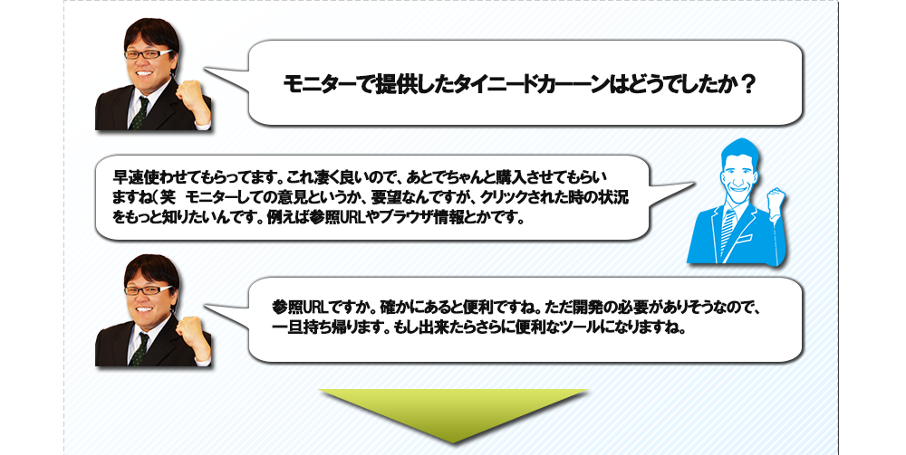 それだけではなく、tinydokaanの機能に短縮URLのアクセス解析があり 私は、twitterやメルマガに活用していましたが、この機能のお陰でどの文章に 反応があるか簡単に分かることができたので、すぐに反応の良い文章に改良して 読者さんや成約を増やすことができました。