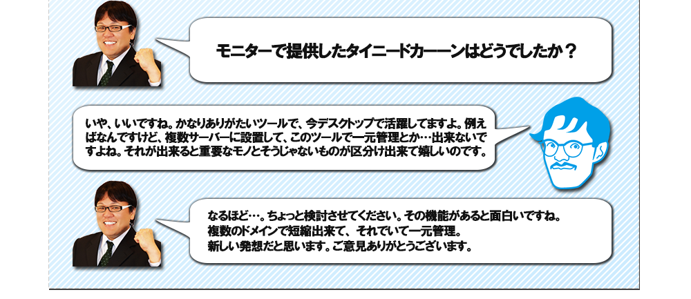その時に、タイミングよく前作のtinydokaanのサービスを知ることができ 初めてレンタルサーバーを借りて自分で短縮URLを管理するようになり 僅かな投資で自分の財産をしっかりと守ることができているので助かってます。